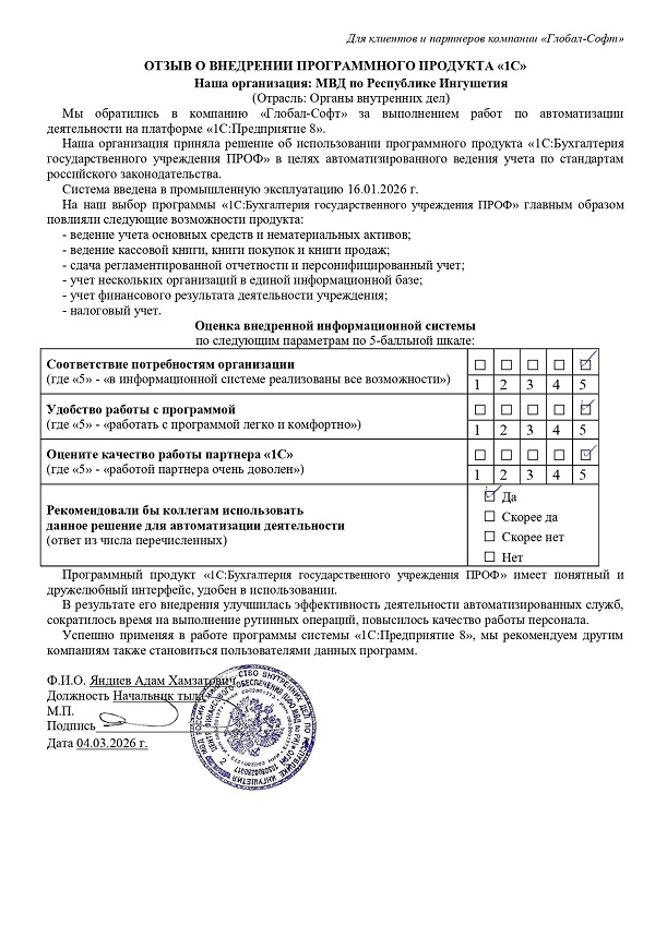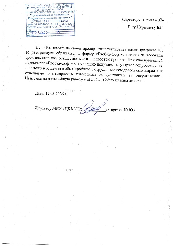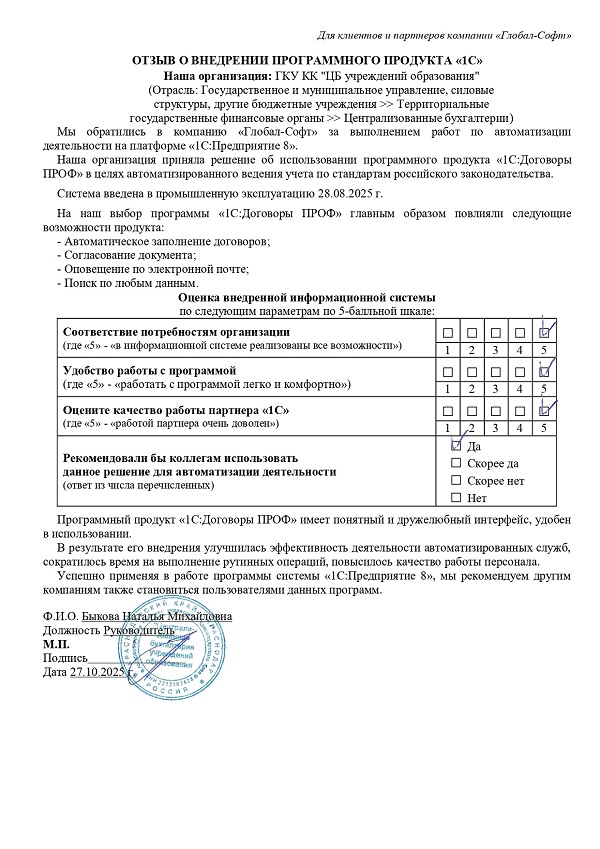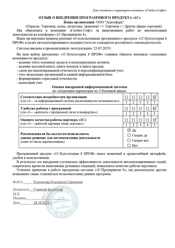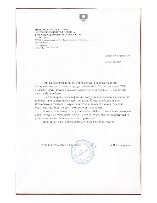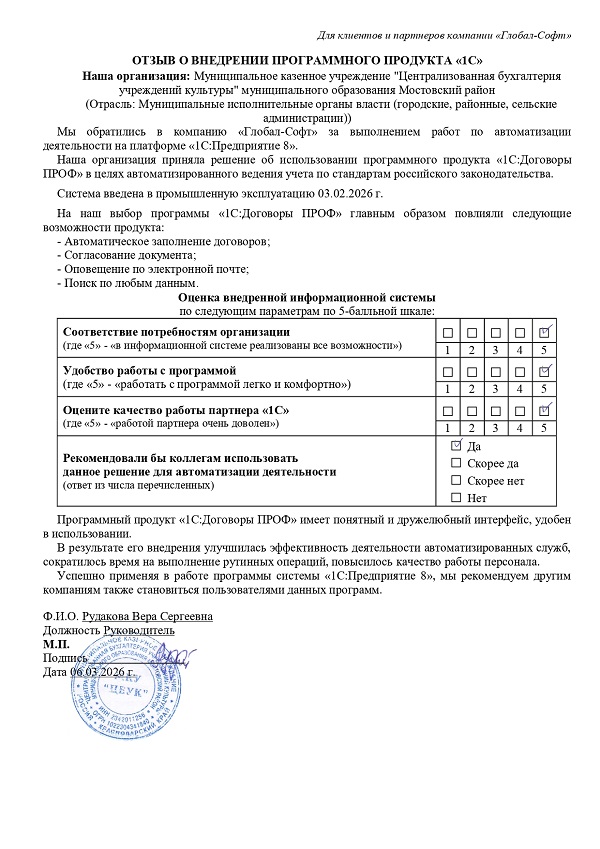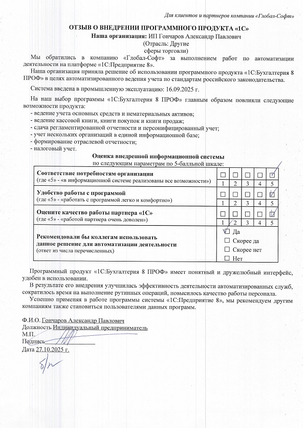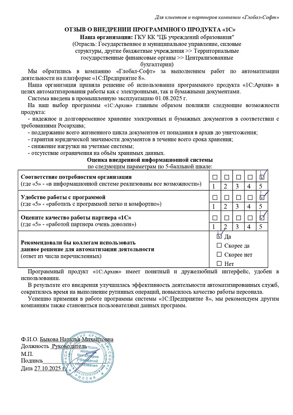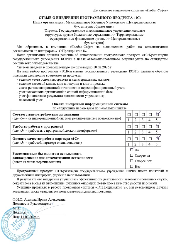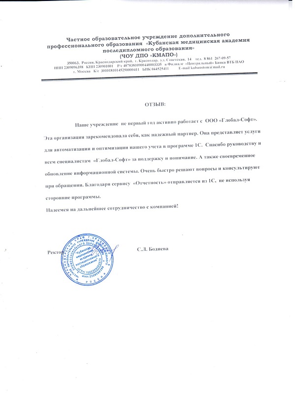 Отзывы о внедрении программ 1С специалистами "Глобал-Софт"