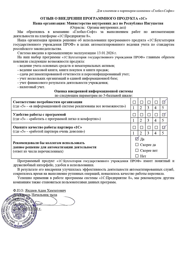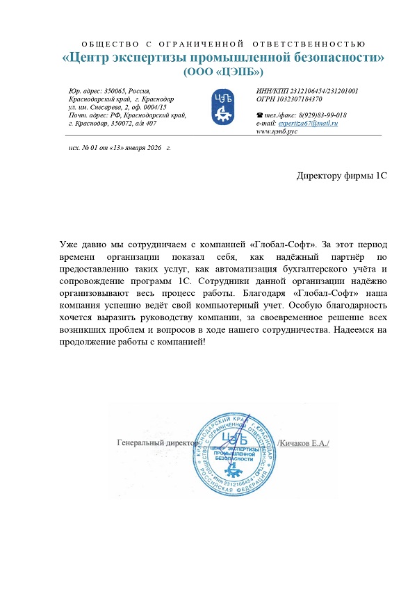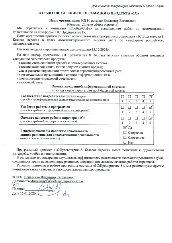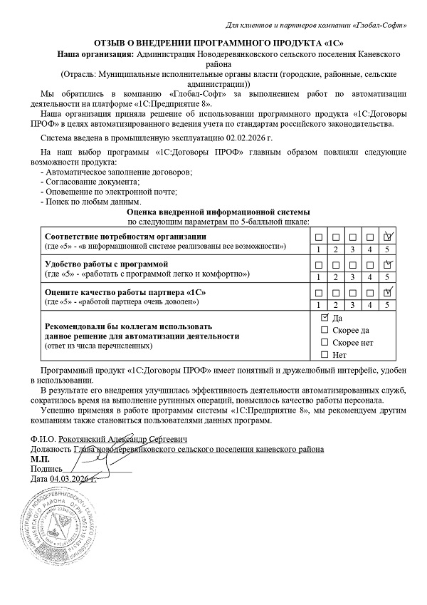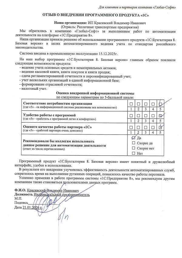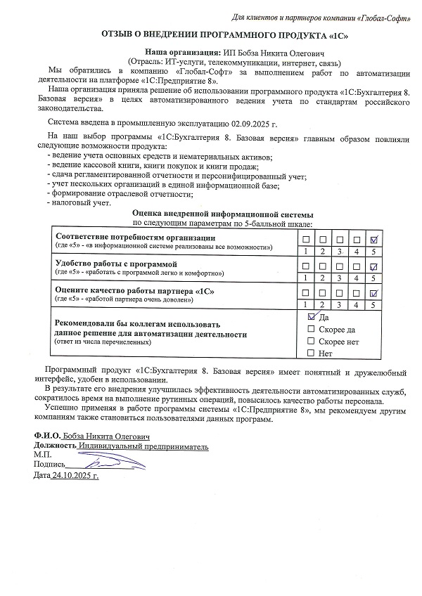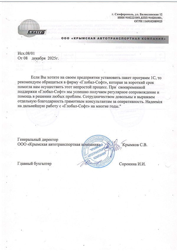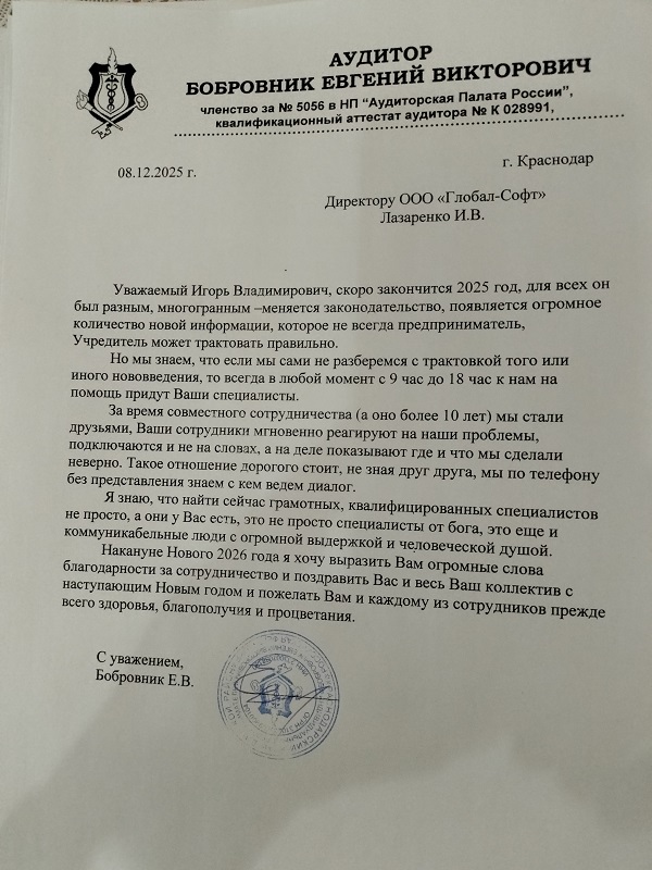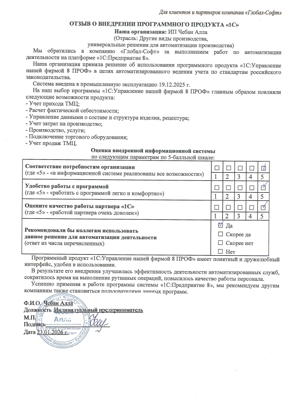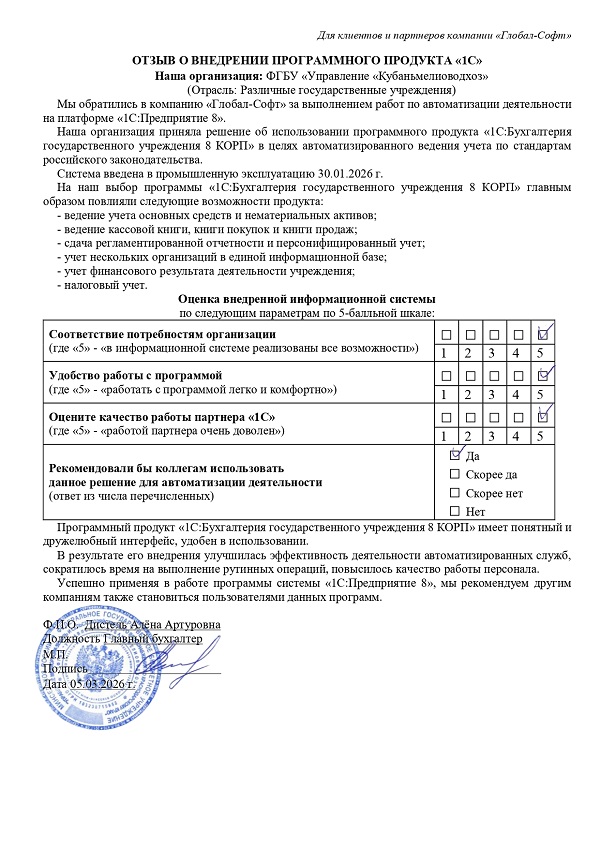 Отзывы о внедрении программ 1С специалистами "Глобал-Софт"