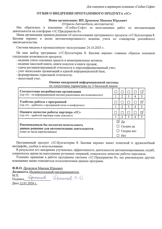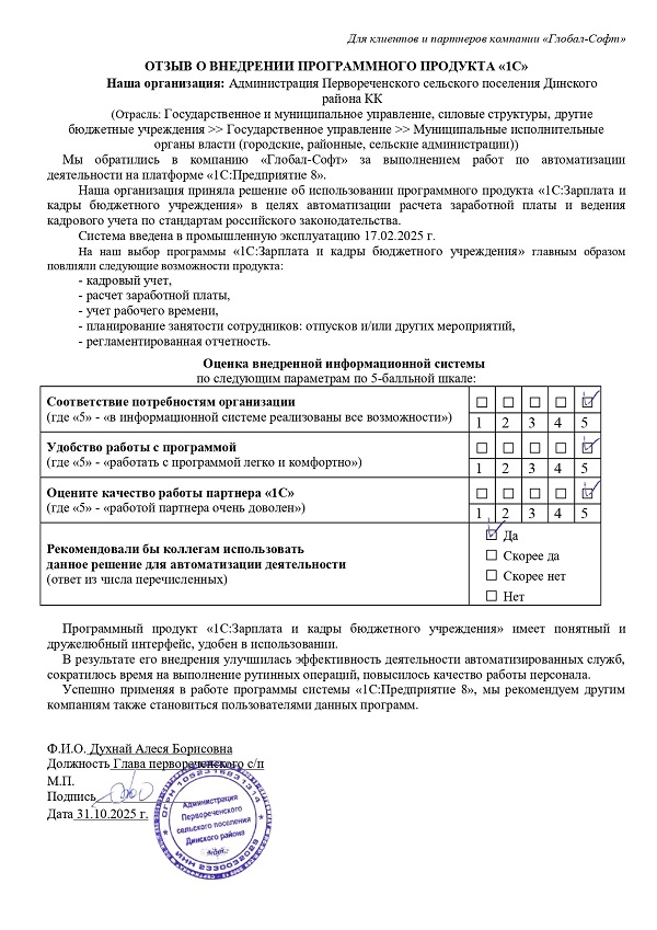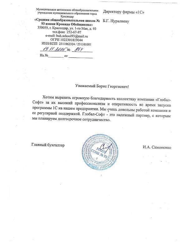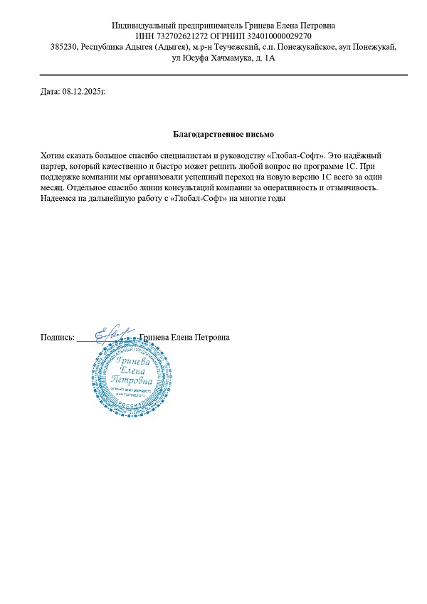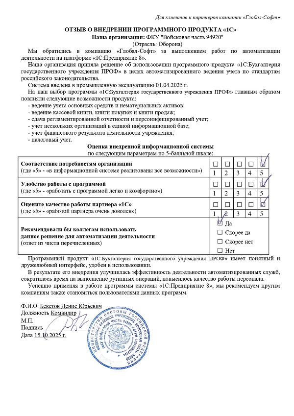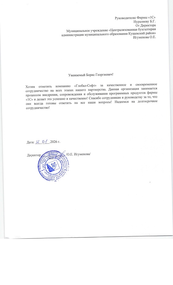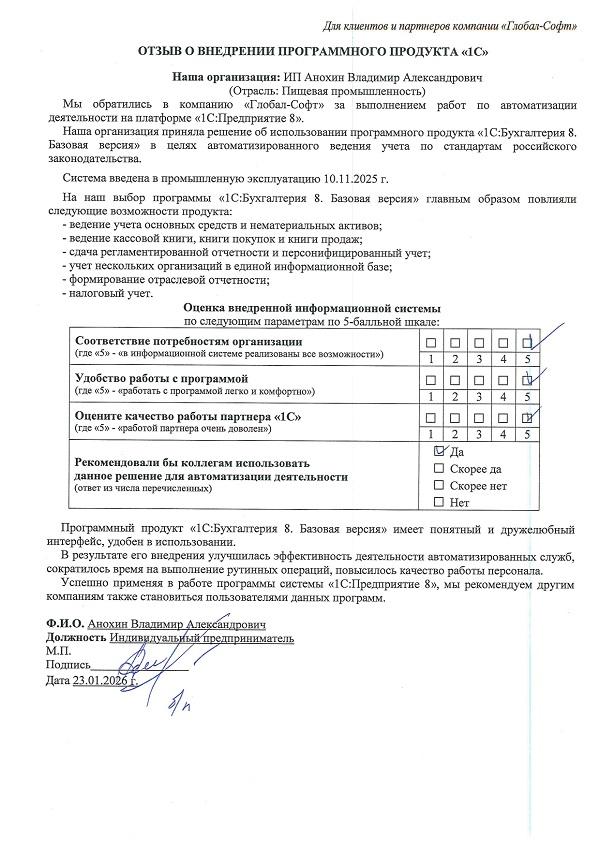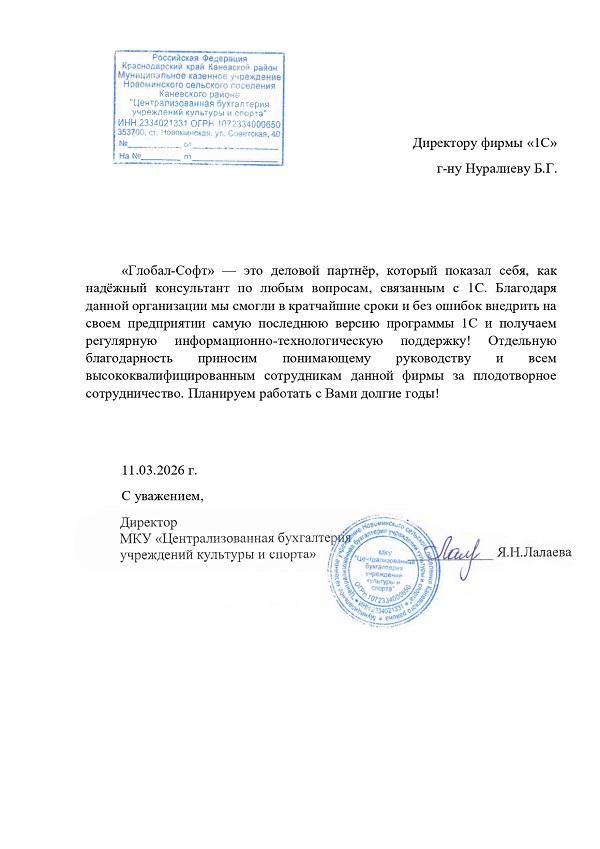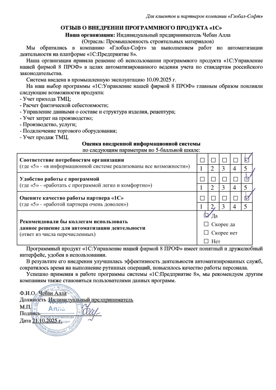 Отзывы о внедрении программ 1С специалистами "Глобал-Софт"