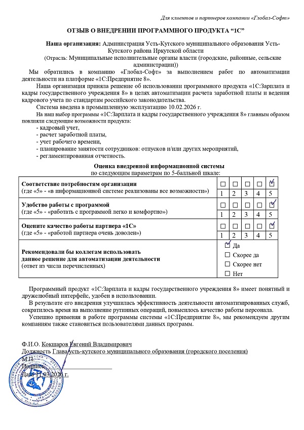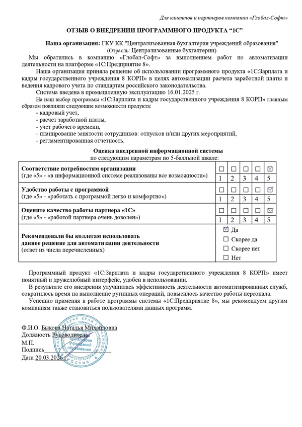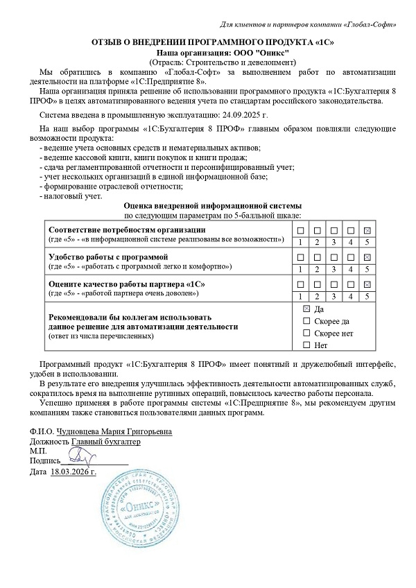 Мы обратились в компанию «Глобал-Софт» за выполнением работ по автоматизации нашей деятельности на платформе «1С:Предприятие 8».