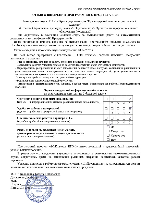 [ALT] => 24.03.2026 Автоматизация учета на базе ПП "1С:Колледж ПРОФ" в ГБПОУ Краснодарского края "Краснодарский машиностроительный колледж"