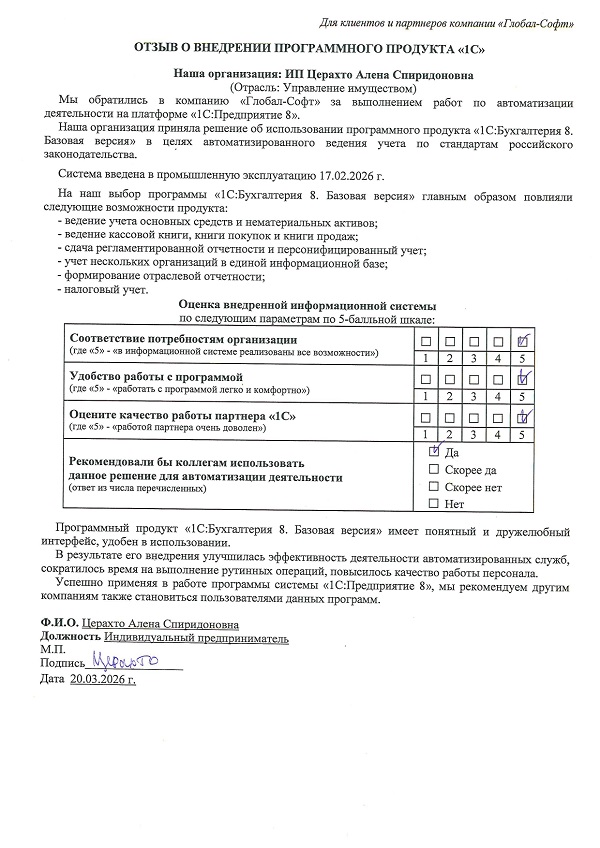 Основная задача наших сотрудников делать работу с программами 1С простой удобной и доступной. Буду рад обратной связи по качеству поставляемых товаров, оказываемых услуг, а также Вашим отзывам о работе компании.