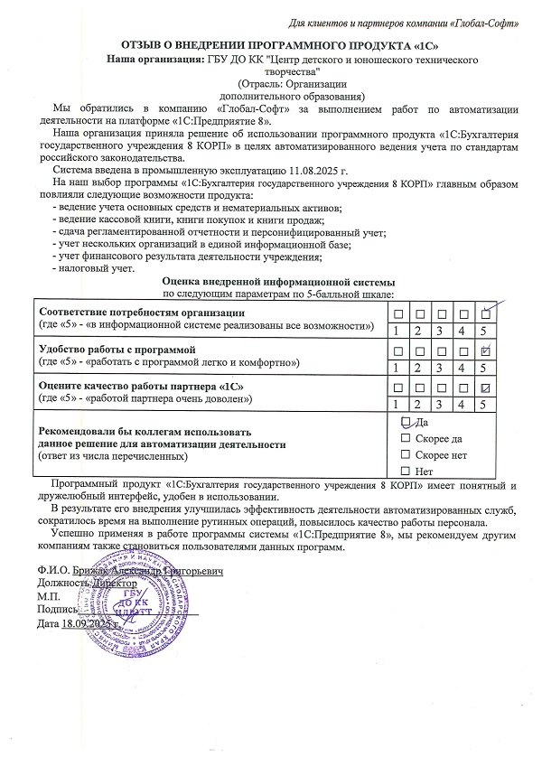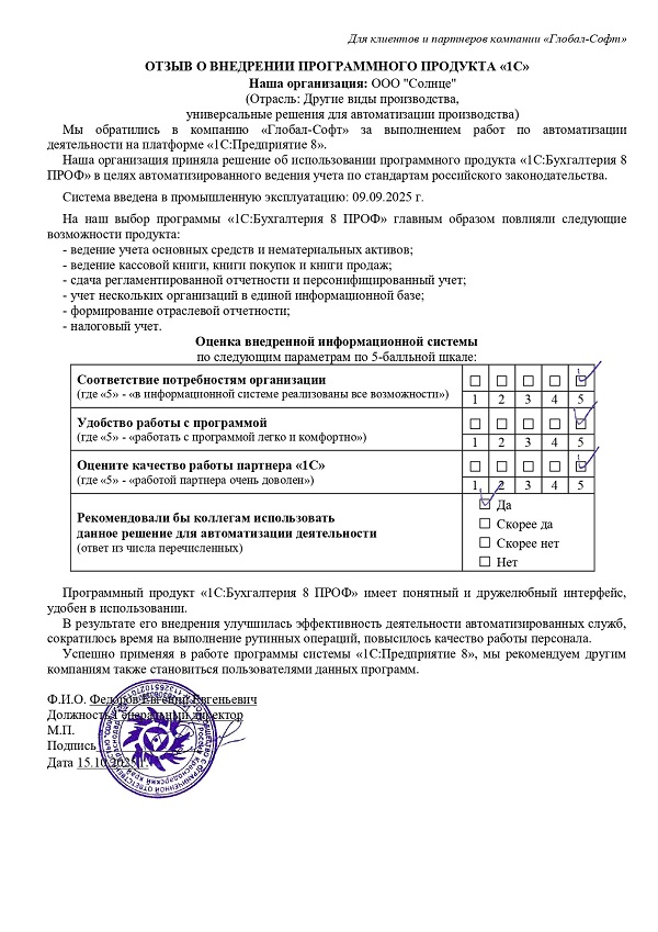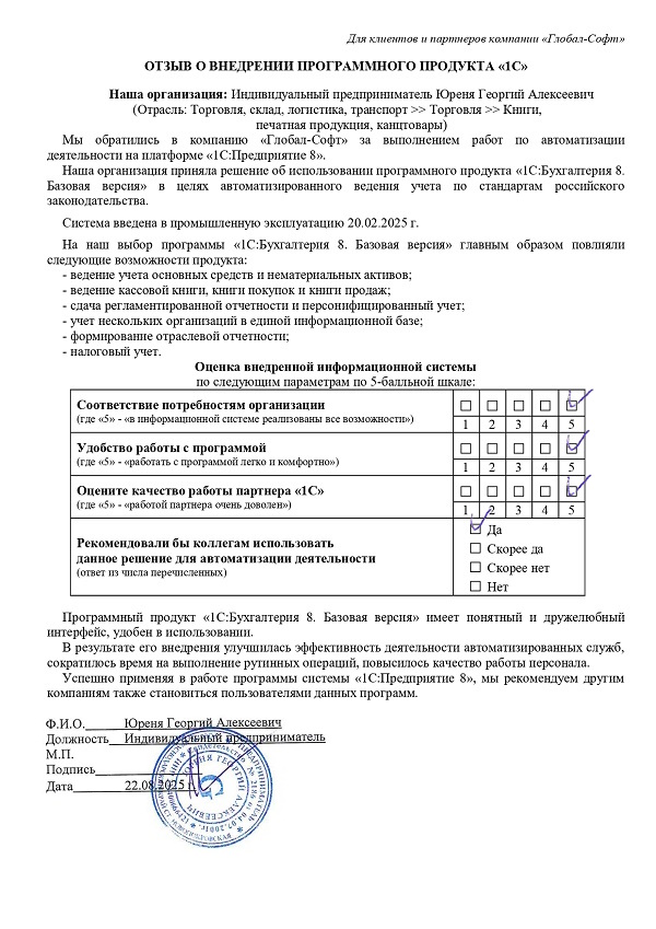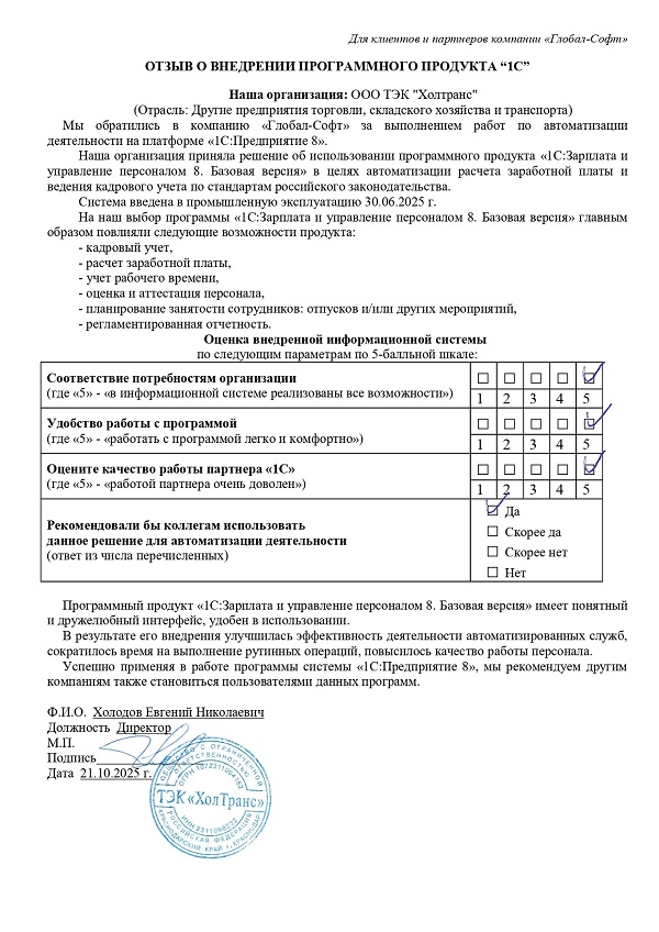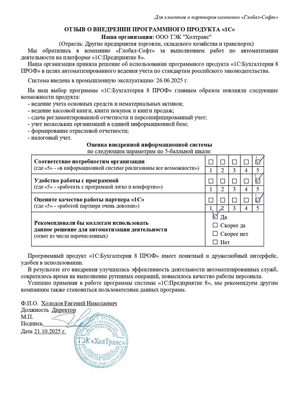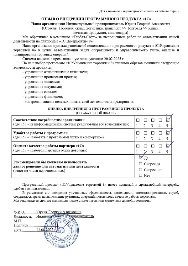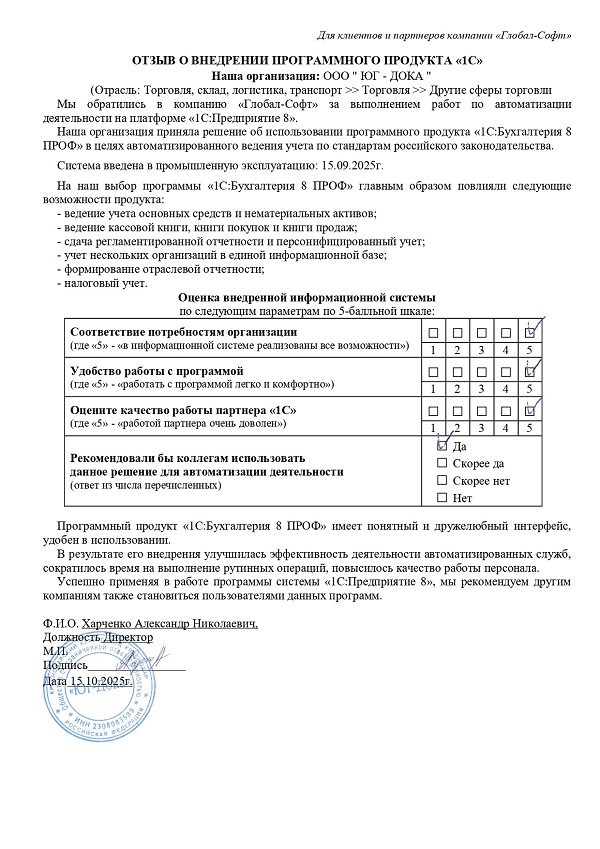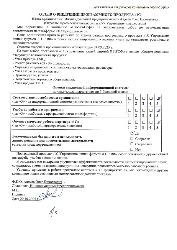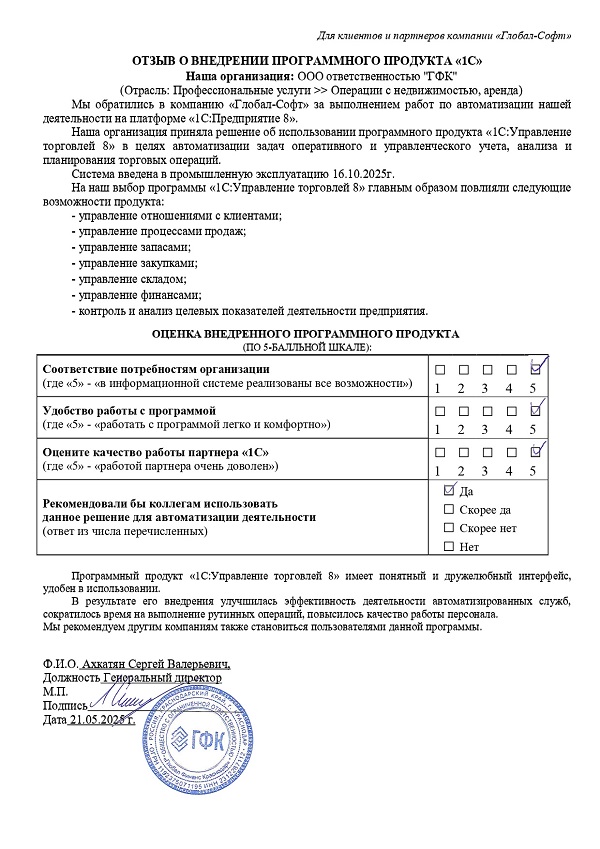 Основная задача наших сотрудников делать работу с программами 1С простой удобной и доступной. Буду рад обратной связи по качеству поставляемых товаров, оказываемых услуг, а также Вашим отзывам о работе компании.