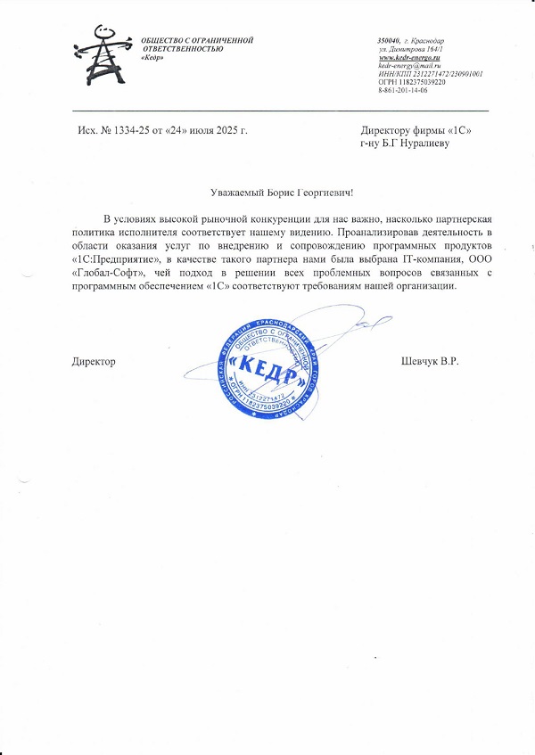 Отзыв о сопровождении и работе специалиста "Глобал-Софт" от ООО "Торговый дом "ЭДЕМ" 1С:Бухгалтерия 8 ПРОФ →