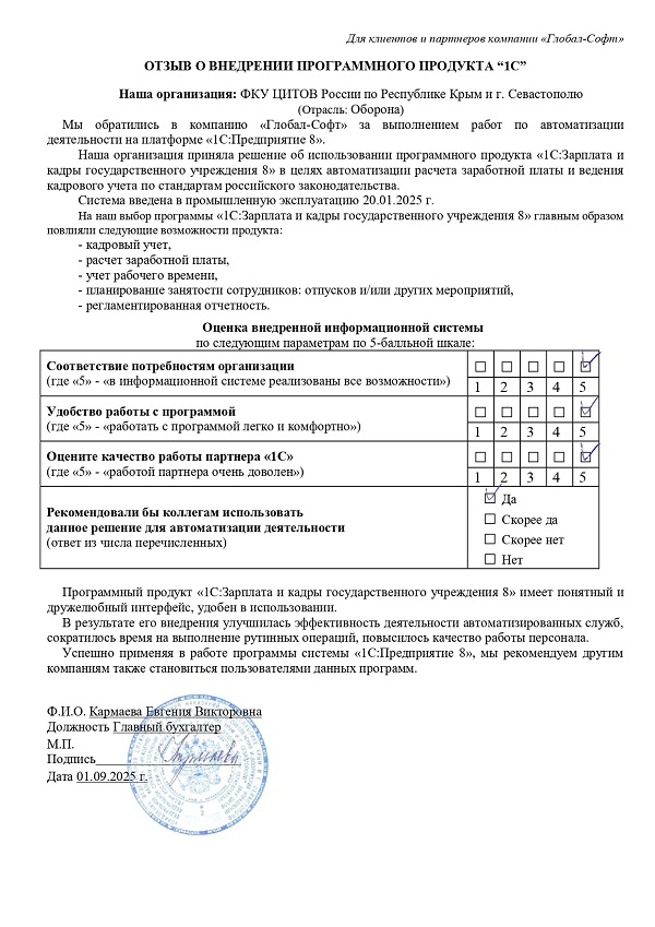 Основная задача наших сотрудников делать работу с программами 1С простой удобной и доступной. Буду рад обратной связи по качеству поставляемых товаров, оказываемых услуг, а также Вашим отзывам о работе компании.