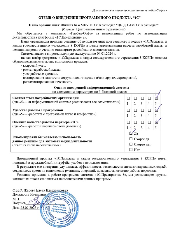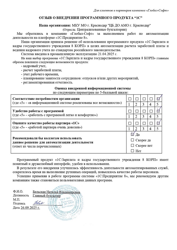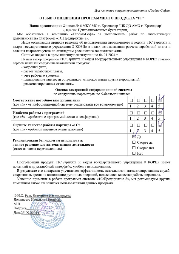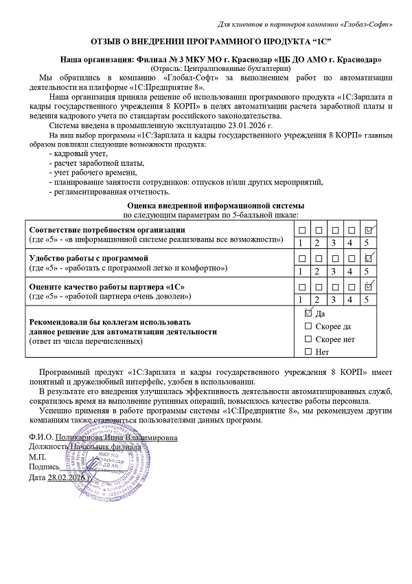 Основная задача наших сотрудников делать работу с программами 1С простой удобной и доступной. Буду рад обратной связи по качеству поставляемых товаров, оказываемых услуг, а также Вашим отзывам о работе компании.